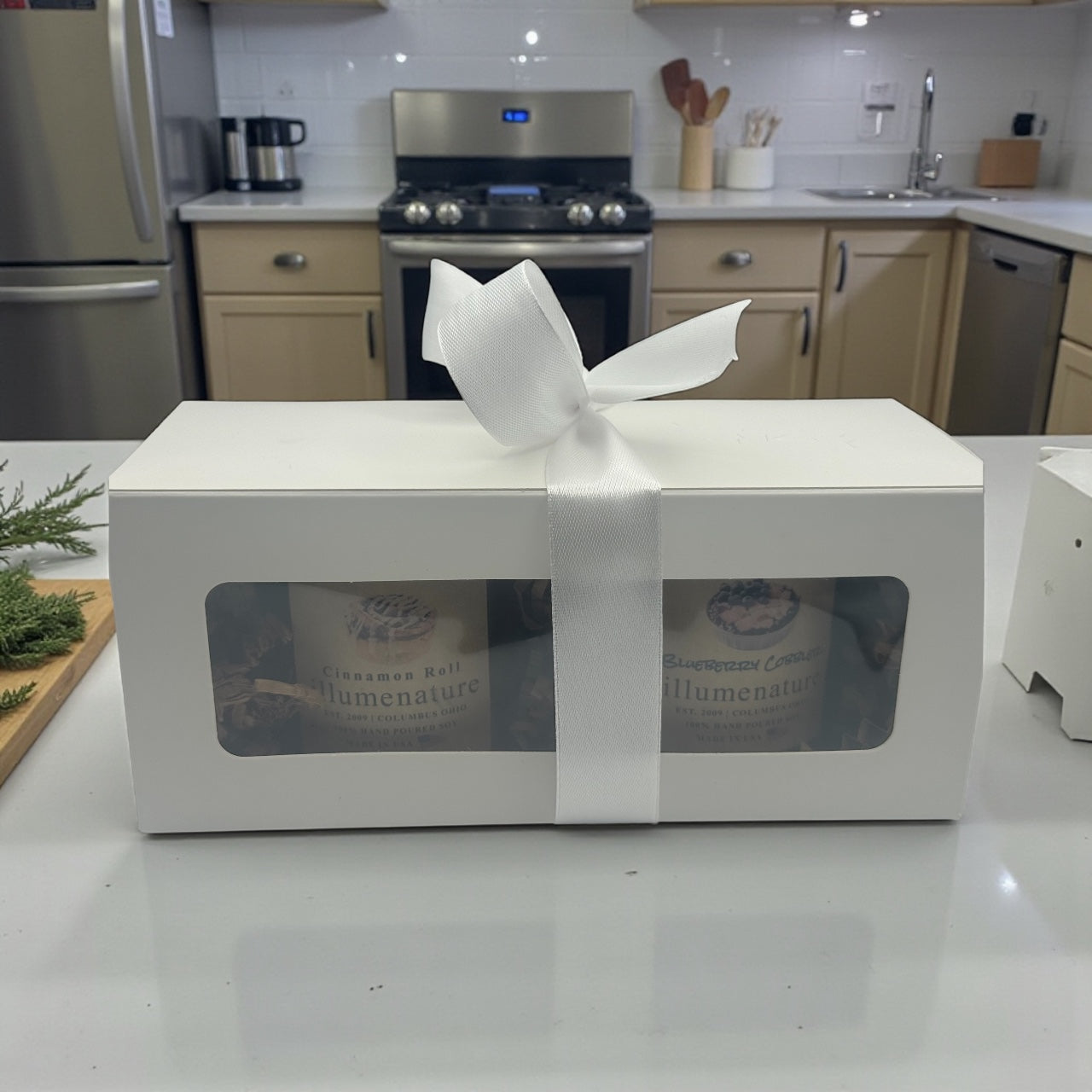 Create your perfect candle duo with our Bakery Bundle, where you handpick two 8oz candles from our beloved Bakery Collection. Choose from Blueberry Cobbler, Banana Nut Bread, Cinnamon Roll, or Apple Pie—each crafted to fill your home with irresistible, warm aromas that feel like fresh-baked comfort. Wrapped in an elegant white gift box with a clear window and finished with a delicate bow, this bundle is equally impressive as a thoughtful present or an indulgent treat for yourself. Crafted from premium soy wax with organic cotton braided wicks, every candle burns cleanly and steadily, transforming any room into a cozy bakery haven.